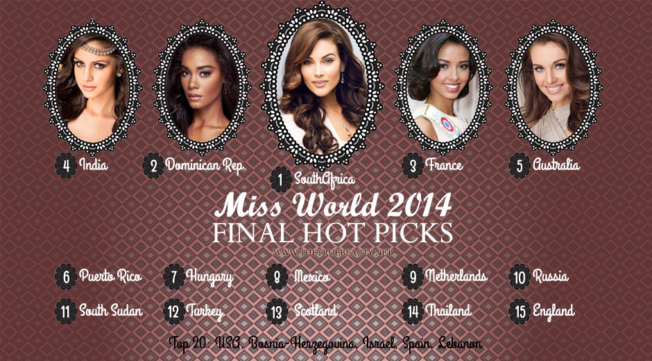 Recordar que el Miss Mundo se celebra desde 1951, siendo esta su edición número 64, y que la primera plaza del ránking histórico la ocupa Venezuela con seis coronas, seguida de India y el Reino Unido, con 5 triunfos cada país. España no cuenta con ningún triunfo, siendo su mejor clasificación la de Maria del Carmen Cervera Fernández (Tita Cervera) en 1961, que fue tercera. Nuestra representante del año pasado, la espectacular Elena Ibarbia, consiguió un meritorio Top 5, la mejor posición de nuestro país desde 1988.