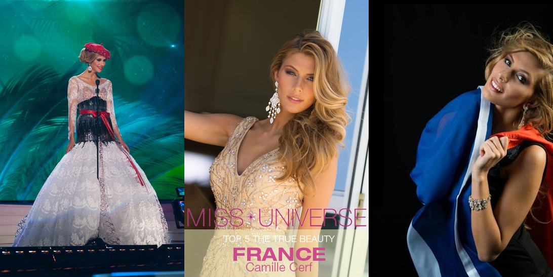 Francia obtuvo su única corona de Miss Universo en 1953 de la mano de Christiane Martel, justo el año en que Denise Perrier ganó el Miss Mundo, y desde entonces no han vuelto a repetir triunfo. Curiosamente, ninguna otra francesa ha vuelto a entrar en el Top 5. En los últimos años, han obtenido buenas clasificaciones con Marie Payet (Top 10 en 2012), Laury Thilleman (Top 10 en 2011), Malika Ménard (Top 15 en 2010) y Chloé Mortaud (Top 10 en 2009). Este año presentan a una excelente candidata, la elegante Camille Cerf quien, a pesar de su escasa preparación, ha tenido una concentración excepcional.
