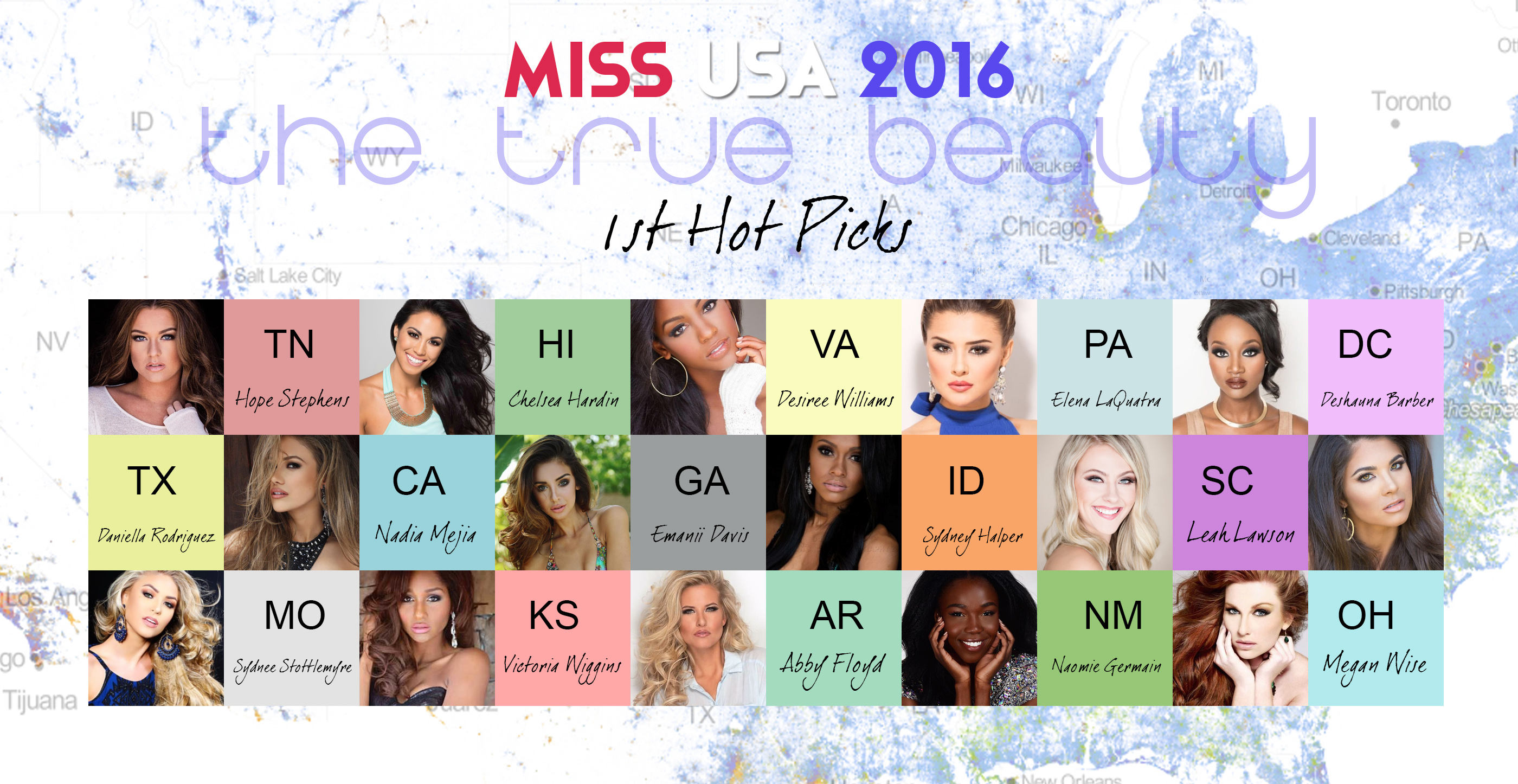 El tiempo vuela y parece que fue ayer cuando publiqué el 1° Hot Picks Miss USA 2015, concursó que ganó por primera vez para el estado de Oklahoma, la rubia y chispeante Olivia Jordan, 2ª finalista en el Miss Universo y una de las mejores portadoras del título de los últimos años. Ya hace varios meses que están escogidas todas las candidatas para la elección de Miss USA 2016, desde que Kentucky coronase a su ganadora en el mes de enero, y los seguidores del certamen estamos entusiasmados ya que nos encontramos ante uno de los grupos más fuertes que se recuerdan. Si bien es cierto que hay bastantes rubias que corren el peligro de opacarse entre sí, también hay un grupo de afroamericanas bellísimas y alguna morena que puede dar la sorpresa como hizo Rima Fakih en el 2010, que destacó en un mar de rubias espectaculares gracias a su exotismo. De hecho, una de las grandes favoritas es Chelsea Hardin, de Hawai, que puede conseguir la primera corona para su estado desde 1997, el año de Brook Lee.