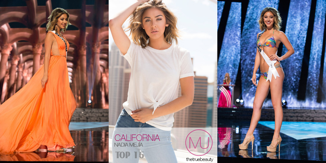 California se sale de los tópicos de las reinas de belleza con la «anti-miss» de esta edición. Nadia Mejía, de orígen ecuatoriano y libanés, es hija del cantante Gerardo Mejía y de la Miss Miss West Virginia USA 1989 Kathy Eicher, por lo que lleva el showbusiness en la sangre. Con una imagen desenfadada, moderna y juvenil, Nadia parece una surfista de las playas de Corona Del Mar, región a la que representó en su estatal. Además, sabe cantar y es una semi-celebridad de las redes sociales, cualidades que la colocan como clara favorita teniendo en cuenta que la nueva organización IMG busca una chica con madera de estrella, como han sido Olivia y Pia. Su actuación en la preliminar ha sido muy criticada, pero creo que ha estado acorde con su imagen diferente y su personalidad burbujeante. Ojo con ella porque sin ser la más bella, puede dar un susto.