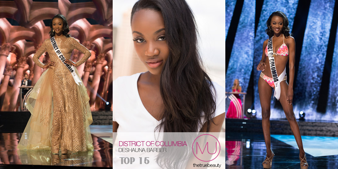 Cada año tenemos en el Miss USA chicas de todas las profesiones posibles, pero nunca antes a una comandante del ejercito de su país, como lo es Deshauna Barber (apellido conocido por los missólogos españoles), que ganó la corona de su estado en su segundo intento después de ser semifinalista el año pasado y tras una pausa después de haberse presentado al Miss Virginia USA en el 2010. En la preliminar ha lucido un espectacular vestido dorado con detalles metálicos de organza que ha sido, directamente, el mejor de la noche. Elocuente, alta y con un cuerpazo de militar, Deshauna tiene el pack completo para llevarse la corona.