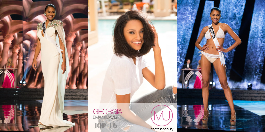 Georgia es un estado que a pesar de enviar cada año candidatas de alto voltaje todavía no cuenta con una corona del Miss USA. Este año todo puede cambiar con Emanii Davis, una de las favoritas top de los missólogos. Emanii es exótica, regia y tiene una personalidad magnética, como muestra en su vídeo de presentación. Tras tomarse un año de descanso de los concursos de belleza después de quedar 4ª finalsita en el Miss Georgia USA 2014, este año se viene con todo y será una de las candidatas a tener en cuenta en la noche del domingo. Por lo pronto ha destacado en la preliminar como uno de los mejores rostros y su Sherri Hill blanco en columna de crépe con hombros en lentejuelas doradas ha sido uno de los highlights de la noche.