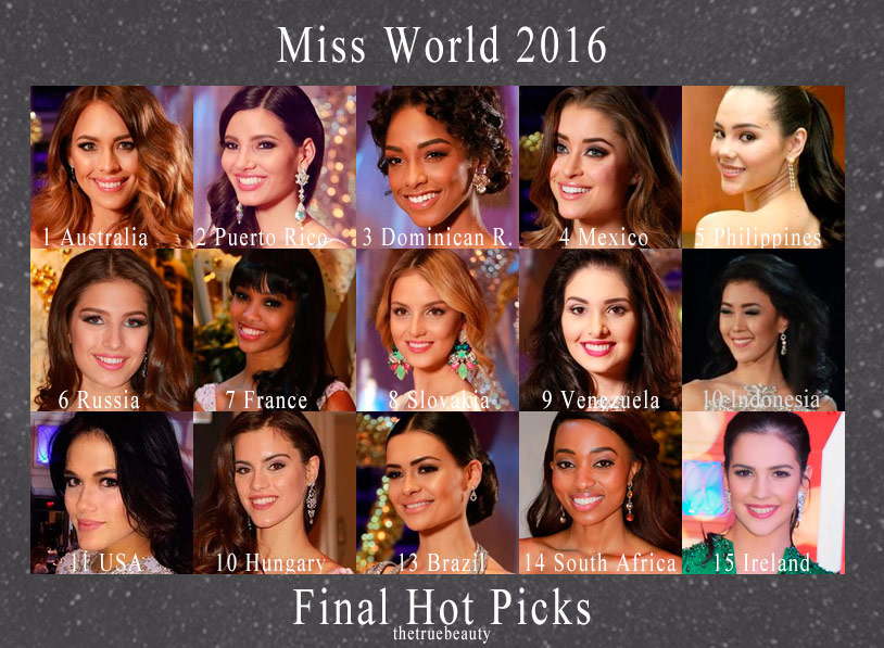 Pero como siempre, el Miss Mundo es un concurso impredecible y lleno de sorpresas. Para nosotros será una noche muy especial, ya que por primera vez una española entregará la corona azul a su sucesora, cerrando así un año mágico de reinado. Mucha suerte a Raquel para esta noche y ánimos a Mireia en sus últimas horas de reinado. Y, mientras llega el momento de saber el nombre de la nueva reina mundial de la belleza, aquí está mi Hot Picks final encabezado por la bella australiana Madeline Cowe.