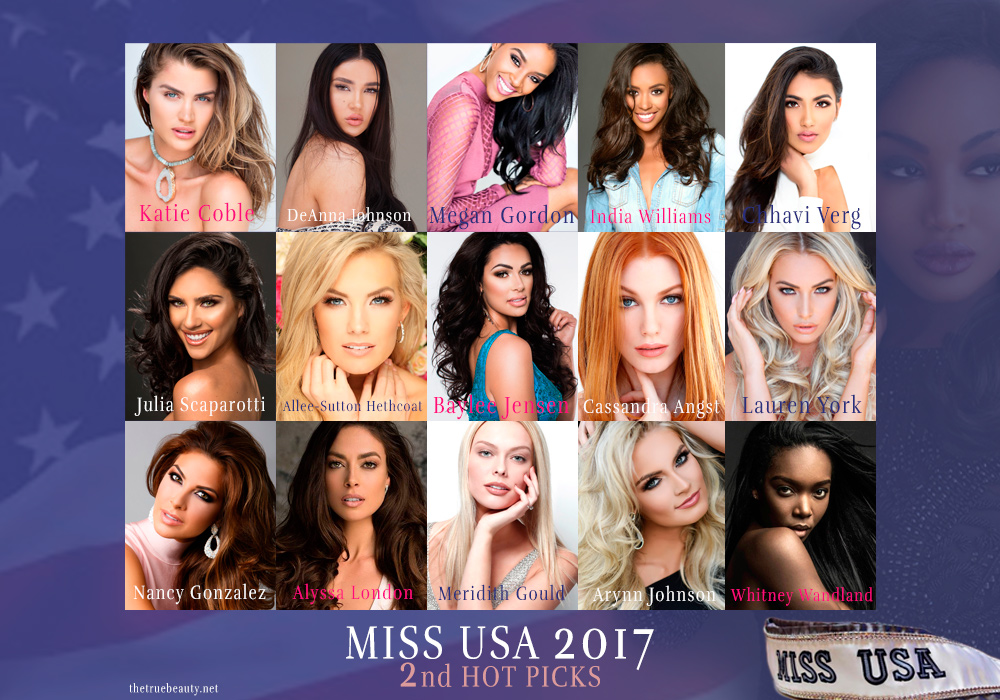 Aunque todavía queda un mes para ver a las chicas en acción, qué mejor que amenizar la espera confecccionando un nuevo Hot Picks, esta vez presidido por la favorita Katie Coble, que participa en el miss USA nada más y nada menos que 10 años después de que quedase tercera en el Miss Teen USA y ganando una corona estatal al quinto intento (participación en el Miss Alabama USA incluida), lo que la convierten en una de las candidatas más esperadas y ansiadas por los missólogos americanos. La entrada más fuerte en mi lista es, precisamente, la de Chhavi Verga, de New Jersey, una de las candidatas más exóticas de este año. También entran Nevada, la sexbomb de esta edición, Alaska y Arkansas, dos veteranas por motivos distintos: la primera por ser la primera miss de mayor edad en concursar en la historia; y la segunda por haber participado en el Miss Teen USA 2015, batiendo también el récord de participaciones más seguidas entre uno y otro concurso.