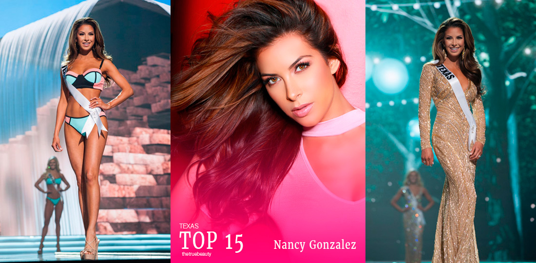 Una semifinal del Miss USA no sería lo mismo sin la presencia de la gran powerhouse, Texas, a pesar de que el estado está teniendo resultados muy irregulares en los últimos años, salvándose tan solo el segundo puesto de Ylianna Guerra en el 2015 entre dos no clasificaciones, algo poco usual en el pasado. La candidata para esta edición, Nancy Gonzalez, continúa con la tendencia texana de presentar misses latinas (es la cuarta consecutiva) aunque tiene un look algo más internacional que sus predecesoras. Ademas, si consiguió ganar en un estado tan dificil despues de tan solo ser semifinalista el año pasado, es que algo está haciendo bien. En la preliminar ha estado impecable, regia y sin fallos evidentes. Apuesta segura para la final.