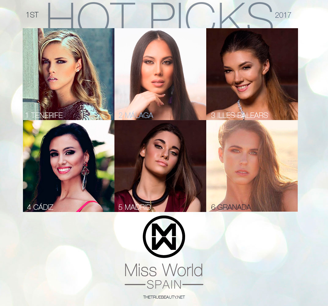 Aunque su preparación es un misterio, no he podido resisitirme a colocar en el número uno de mi ránking a la tinerfeña Cara Aguiar, una de las misses más anticipadas ya que fue escogida en su provincia nada más y nada menos que en el 2014 junto con el que sería Mister International Spain 2016 Daniel Rodríguez, y ha tenido que esperar todos estos años para participar en el nacional. La que si parece tener el pack completo es la recientemente escogida por Málaga, Jennifer Medalle, no solo por su exótica belleza de orígenes filipinos (lo que siempre es un plus en los certámenes internacionales) sino también por su preparación académica que incluye estudios como bailarina. Otras que suenan como favoritas son las candidatas de Baleares, Elisabeth Tulián, y su primera dama en el regional, Paula Delgado, a la que curiosamente se le otorgó la banda de Madrid en la noche de la elección. Si el jurado se quiere decantar por una belleza más española, la representante de Cádiz es ideal, gracias a sus rasgos andaluces que la convierten en una de las chicas más llamativas por ahora. Cierro mi Top 6 inicial con la veterana Rocío Barea, representante de Granada, que ya participó en el Miss World Sevilla 2013 y tiene amplia experiencia como modelo. Otras que destacan son las misses de Cantabria, A Coruña, Las Palmas, Almería, Canarias, Pontevedra, Córdoba y Navarra, la mayoría nuevas en el circuito miss, por lo que tienen la oportunidad de sorprendernos durante la concentración.