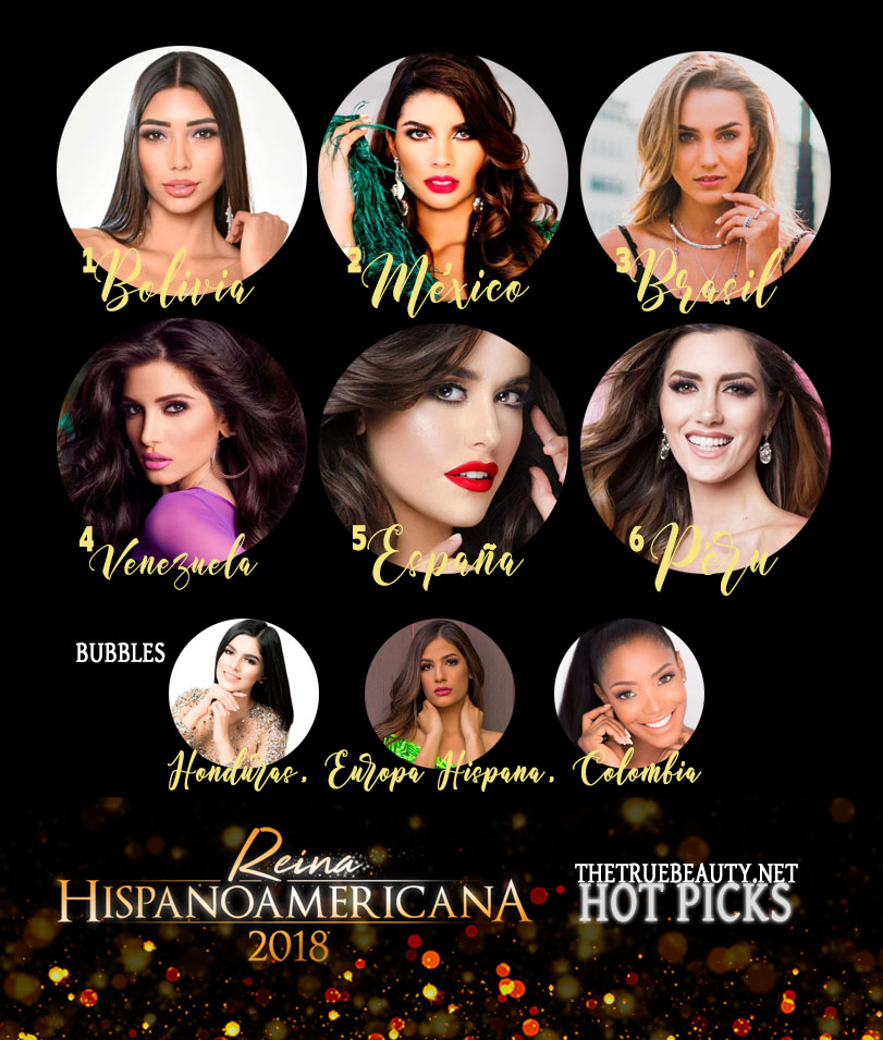 El palmarés histórico lo encabeza, como no, Venezuela con un total de 6 victorias, seguida por Brasil (5), Colombia (4) y la anfitriona Bolivia (3). Para Bolivia, esta puede considerarse la preparación definitiva de sus candidatas al Miss Universo, ya que suele ser tradición que envíen a su ganadora principal para representarlos como anfitriones. Este año le toca el turno a la espectacular Joyce Prado, una de mis favoritas al Miss Universo, y que ocupa la primera posición de mi ránking de posibles ganadoras para la corona Hispanoamericana. No menos espectacular es la mexicana Aranza Molina, que fue segunda en el reality Nuestra Belleza Mexico y se postula como una de las grandes favoritas para esta noche, con tres bandas obtenidas hasta el momento. La brasileña Isabele Pandini, Miss Sao Paulo Mundo 2016, es otra de las candidatas fuertes, ganando las bandas de Miss Amazonas y Miss Deporte Patra.
