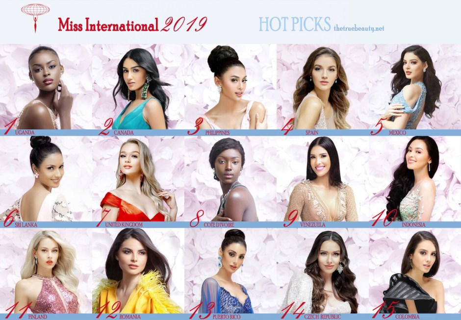 Tras el Miss Grand International, ganado por Venezuela, y el Miss Tierra, con triunfo de Puerto Rico, continúa la temporada alta de concursos internacionales con el Miss International 2019, cuya final se llevará a cabo el 12 de Noviembre en el Tokyo Dome City Hall de la capital japonesa. Este año son 83 las candidatas que se disputarán la icónica corona de peluche que actualmente posee la venezolana Mariem Velazco, incluyendo las representantes de los países debutantes, Burkina Faso y Guinea Ecuatorial