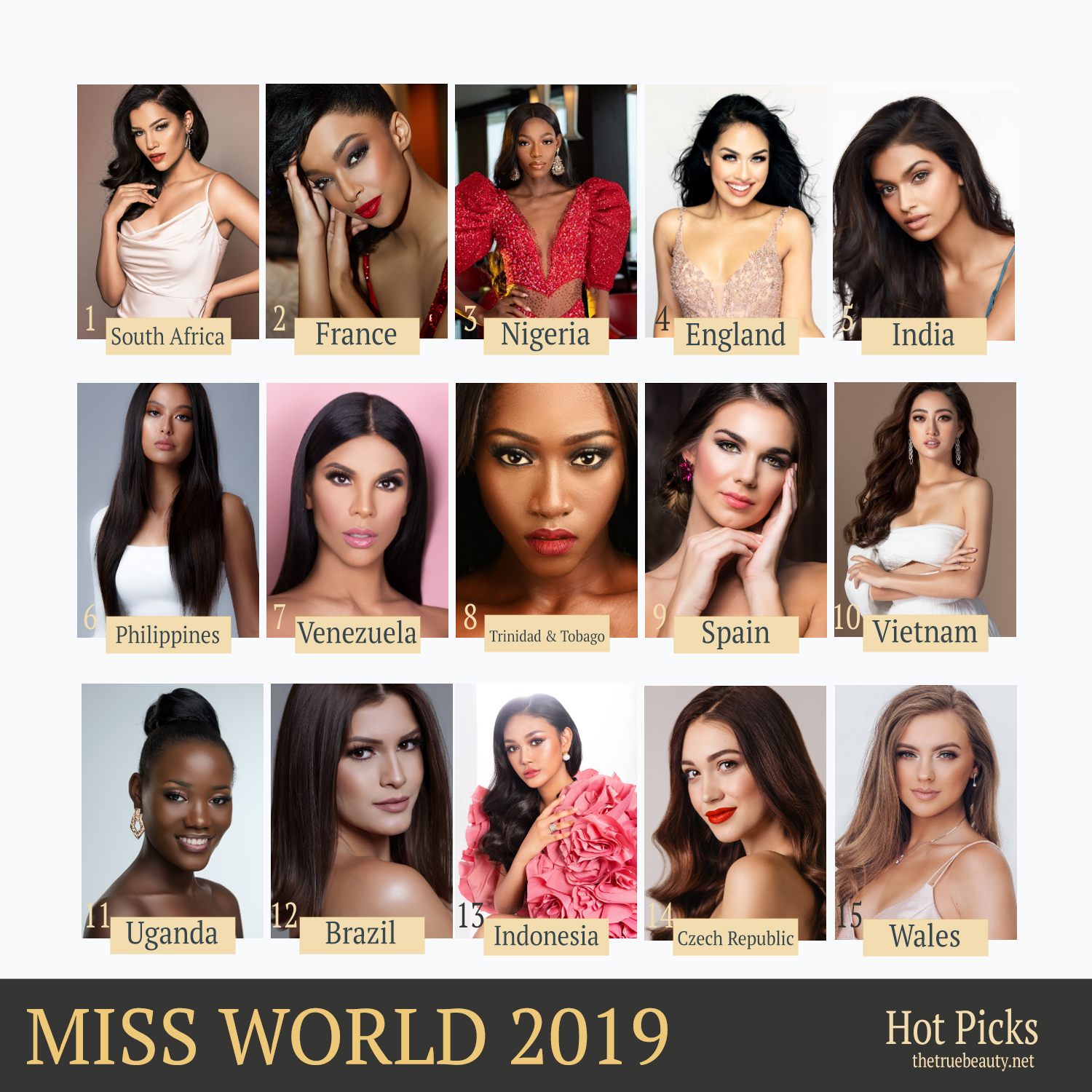 Nuestra representante es la bellísima María del Mar Aguilera, que ganó el Miss World Spain de este año con la banda de Córdoba y que, a pesar de haber lucido espectacular y radiante durante toda la concentración, no figura entre las favoritas al no haber destacado en los Fast Tracks previos. Las que si lo han hecho y por lo tanto son las grandes favoritas para la final de hoy son las candidatas de Nigeria, Francia, India, Venezuela, Trinidad & Tobago, Jamaica, Vietnam y las islas Vírgenes Británicas. A ellas se le sumarían como grandes postuladas para la corona las representantas locales de Inglaterra y Gales, junto a Brasil, México, República Checa, Moldavia y Russia, que también suenan mucho en los tops. Pero como siempre, la última palabra la tendrá Julia Morley. ¿Habrá sorpresa este año como ocurrió en la edición 2009 con la gibraltareña quedando atrás a las grandes favoritas?