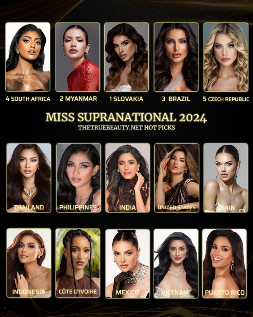 Nuestra representante es la bellísima Elizabeth Laker, tinerfeña de 26 años, quien fue la ganadora del Miss RNB España 2024. Elizabeth ya tiene experiencia en concursos internacionales, ya que fue nuestra representante en el Miss International del 2017. Este año, vuelve con más experiencia y madurez, aunque en su camino hacia la corona Supranational se las tendrá que ver con grandes favoritas como la sudafricana Bryoni Govender, que fue Top 20 en el Miss Universo pasado, la checa Justýna Zedníková, quien ha deslumbrado por su belleza tan parecida a la de la actual Miss Mundo, y las siempre competitivas asiáticas, sobre todo las representantes de Indonesia, Tailandia, Filipinas y Myanmar. Por América Latina, las favoritas son las representantes de Brasil, México, Perú, Bolivia y Curaçao, quien también tiene experienca en Miss Universo ya que fue la representante de su país en 2016, además de haber sido Primera Finalista del Miss International 2017.